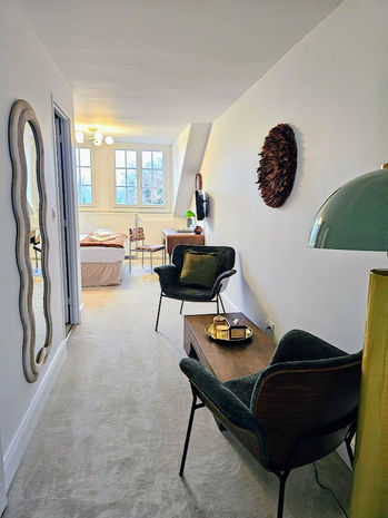 Sie befinden sich im ersten Stock des Hauses des Schlosses, auf der Rückseite des historischen Gebäudes. Sie werden die Ausrichtung dieser Zimmer zu schätzen wissen: Auf der einen Seite befindet sich der Swimmingpool und auf der anderen ein Korridor mit einem großen Glasdach mit Aussicht des Parks.