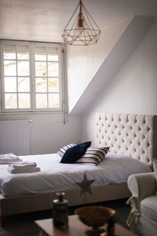 Situées au premier étage dans la maison du Château, à l'arrière de la bâtisse historique, vous apprécierez l'orientation de ces chambres avec d'un coté la piscine et de l'autre un couloir longé d'une grande verrière avec vue sur le parc.